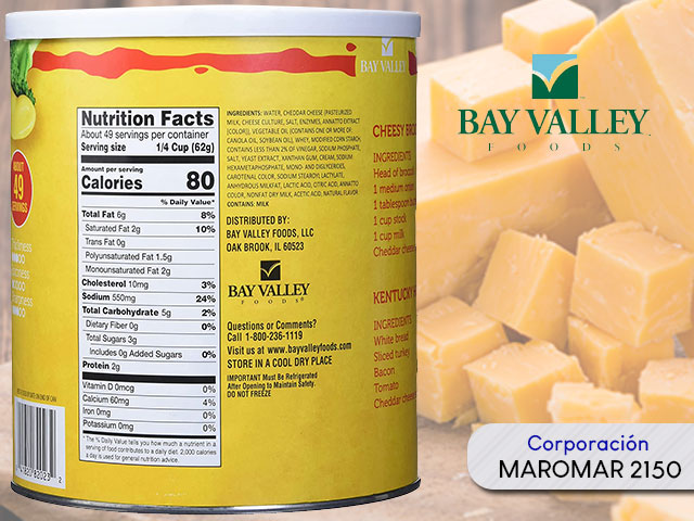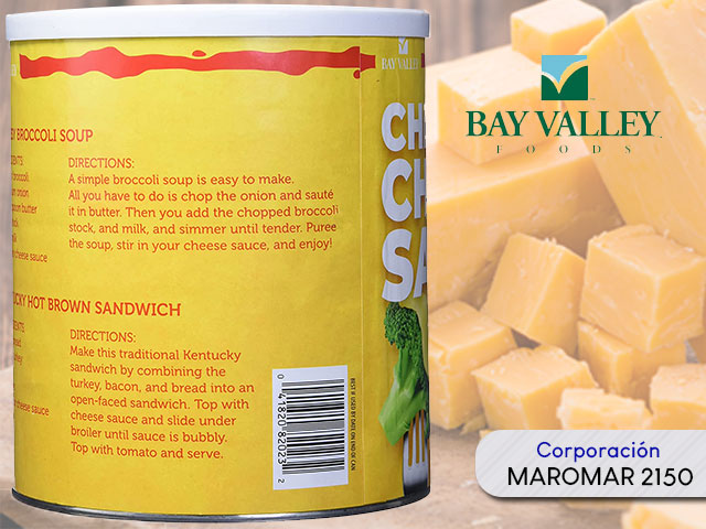 La salsa de queso Cheddar de Bay Valley Food contiene aproximadamente 48 porciones en cada lata no perecedera.